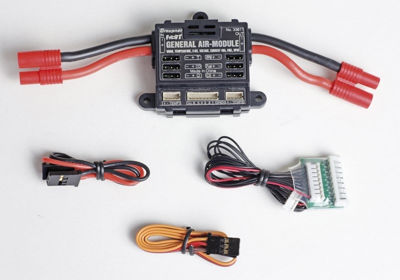 Anschlüsse: 2x Temperatur wahlweise 0 bis 120°C oder 200°C und Spannungsmessung bis 60 V DC 1x Drehzahlmessung bis 100 000 U/min mit Zweiblattluftschraube 1x Fahrtenregler/Servo Eingang, 1x Eingang Drehzahlregelung, 1x Fahrtenregler/Servo Ausgang für Drehzahlregelung 1x Strom- und Spannungs- und Kapazitätsmessung bis 40 A (Puls 1 s bis 60 A) und bis 30 V 1x Einzelzellenüberwachung für 2 - 6S Lithium-Akkus (LiPo, LiIo, LiFe) 1x Empfängerstromversorung Eingang und Ausgang 1x Telemetrieanschluss für Empfänger 1x Treibstoffsensor 0%/25%/50%/75%/100%